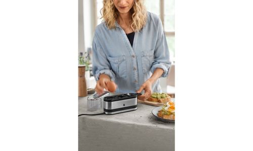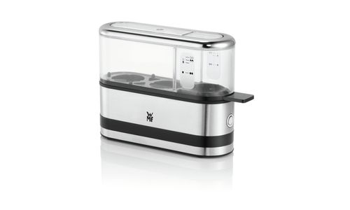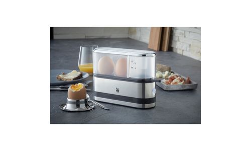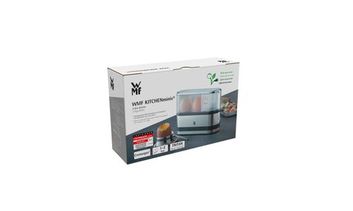 Met de WMF KITCHENminis® eierkoker kan je een of twee eieren, maat S tot XL, eenvoudig koken! Ben je het geklungel zat met de pan met kokend water, waar je heel voorzichtig je ei op een lepel legt om hem vervolgens zachtjes in het kokend water onder te dompelen. De kans dat het breekt is altijd nadrukkelijk aanwezig. Natuurlijk heb je dat geklungel niet met deze eierkoker! Plaats eenvoudigweg de eieren in de koker en laat het apparaat het werk doen! De deksel is gemaakt van hoogwaardig Tritan en is BPA-vrij, stabiel en gemakkelijk te reinigen. De waterhoeveelheid kan gemeten worden aan de hand van de grootte van het ei en de vereiste hardheid met de geïntegreerde maatbaker. Zodra de eieren klaar zijn klinkt er een akoestisch signaal.