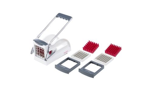 Fritesnijder & groentestickler biedt een breed scala aan toepassingsmogelijkheden voor hedendaagse voeding • Snijden van frites en groenten en fruit (bijv. voor salades en dipsauzen) • Gemaakt van bijzonder hoogwaardig kunststof • Met 3 roestvrijstalen mesinzetten voor verschillende snijden diktes (12 x 12 mm, 10 x 10 mm, 9 x 9 mm) • massief stalen drukbeugel • zeer effectieve zuignap