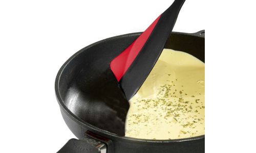 Een must in elke keuken: met de flexibele spatel / spatel kunnen maaltijden snel en eenvoudig in de gecoate koekenpan worden gekeerd en aan tafel geserveerd. Het heeft een stijve zwarte en een flexibele rode kant, waarmee je zelfs het gebraad in de pan gemakkelijk kunt schrapen. Dit maakt hem ideaal voor gecoate potten en pannen en dankzij de lange kunststof steel hoef je niet bang te zijn voor brandwonden.