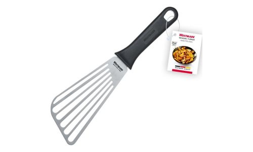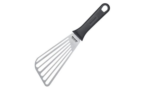 Deze hoogwaardige draaier is gemaakt van roestvrij staal en heeft een recht, flexibel en gesleufd mes voor intensief gebruik in de professionele keuken. Het is ideaal voor het optillen en draaien van geroosterd en gegrild voedsel op grillplaten, pannen, plancha's of BBQ. De sleuven zorgen ervoor dat overtollig vet eraf kan druipen en broodkruimels worden niet beschadigd door het kleinere contactoppervlak met het vlees. Door zijn extreme stabiliteit is hij ideaal voor gebruik in de commerciële sector of voor de grillprofessional thuis.