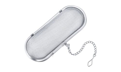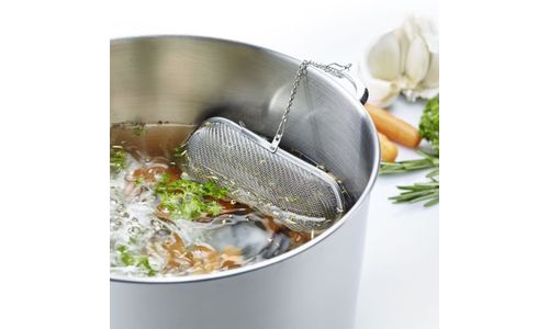 De ovale kruidenzeef, ca. 11 cm lang en meer dan 4 cm in diameter, is de ideale maat voor het bewaren van specerijen en kruiden tijdens het koken en is ook geschikt voor het zetten van thee in een dienovereenkomstig grote pot. Door simpelweg de deksel te openen is hij makkelijk te vullen en dankzij het vergrendelingsmechanisme aan de zijkant weer goed dicht te doen. De lange ketting met geïntegreerde haak zorgt ervoor dat de zeef tijdens het koken niet in de pan valt. De praktische roestvrijstalen zeef kan zowel in restaurants als thuis worden gebruikt. Het is smaakloos en kan na gebruik gemakkelijk in de vaatwasser worden gereinigd.