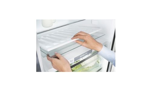 De GlassLine draagplateaus zijn bij een deuropening van 90° volledig uit te trekken of te verwijderen om schoon te maken. Dit geldt ook voor – indien van toepassing – de groentelade, de BioCool lade, de twee of drie 0°C laden van alle BioFresh modellen en de diepvriesladen