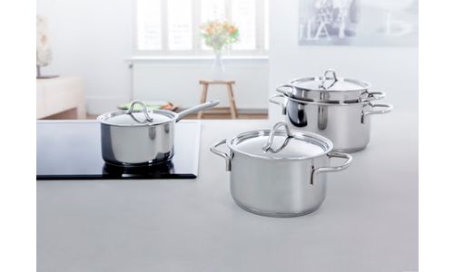 Op zoek naar een complete pannenset van een uitstekende kwaliteit? Dan bent u bij deze pannenset van het gerenommeerde merk BK aan het juiste adres. De Profiline serie is volledig gemaakt uit hoogglans, gepolijst, roestvrij edelstaal. Dit materiaal geeft de pannenserie een extra luxe uitstraling. De klassiek vormgegeven grepen zorgen voor een stevige grip. De bodem van de pannen is uitgerust met een zogeheten sandwichbodem, een bodem die een perfecte warmteverdeling heeft en zorgt voor een snelle opwarming. De pannen zijn geschikt voor alle warmtebronnen en kunnen zelfs in de oven.