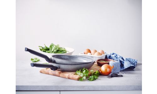 Met deze speciale BK serie bak je gezond op alle warmtebronnen. De hippe stonelook coating en een stevige kunststof greep maakt deze pannen een opvallende verschijning op elk fornuis. De hoogwaardige keramische non stick-coating (PFAS-vrij) kan tegen een stootje en is perfect voor het bakken of braden zonder of met weinig oliën of vetten. De ergonomische koudgreep zorgt voor een veilige grip onder alle omstandigheden. De pan is geschikt voor alle warmtebronnen, kan in de oven (tot 160°C) en kan na gebruik in de vaatwasser.