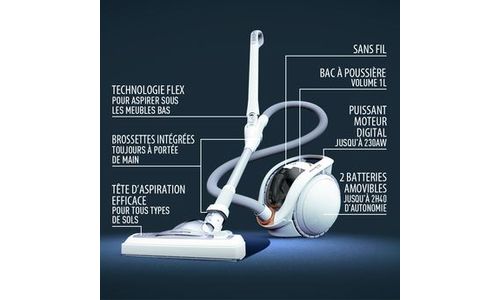 Lange autonomie tot 2u40 (met 2 batterijen inbegrepen) om uw volledige interieur (tot 250m2) te reinigen zonder heroplading