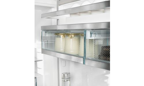 In hoogte verstelbare deurvakken met gehard glazen bodem, edelstalen steunrails en verschuifbare flessen- en conservenhouders maken een optimale indeling van de deur mogelijk. De deurvakken zijn groot genoeg voor 2 liter verpakkingen.