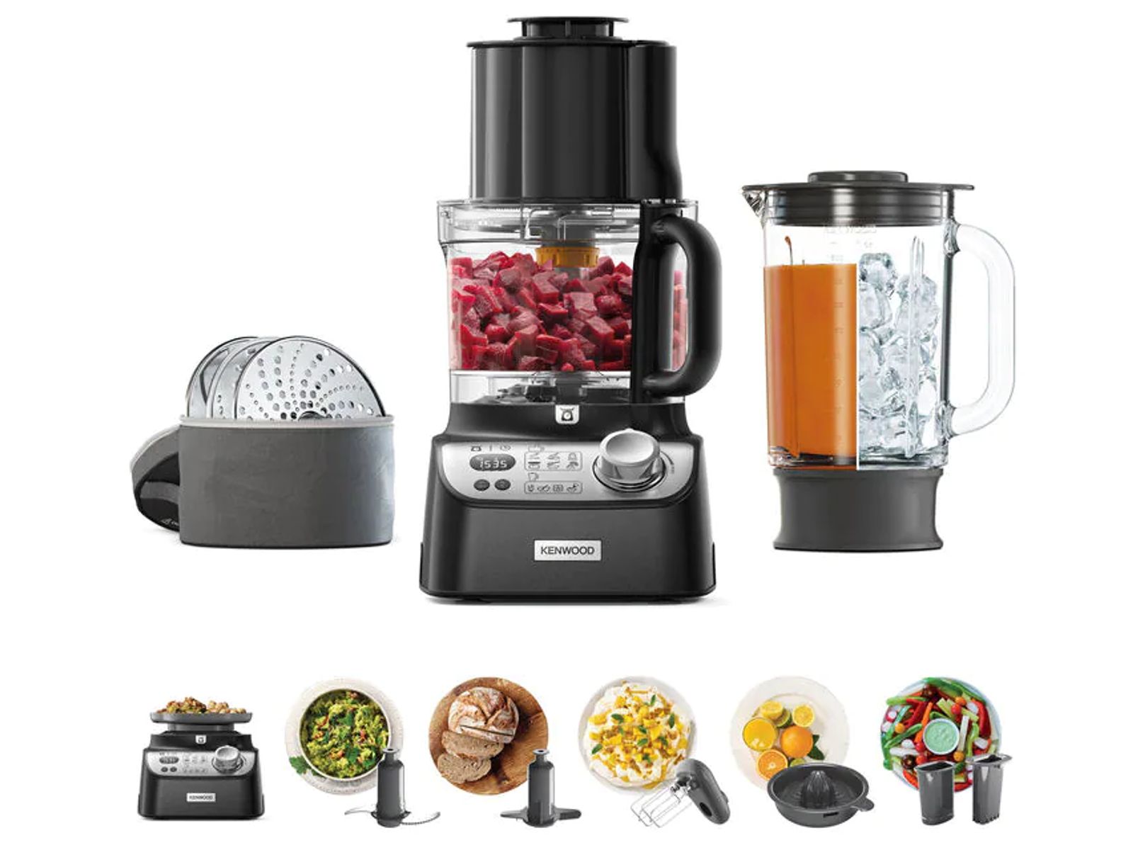 1000W, die cast metal base, 3L bowl with wide feed tube, 1,5L thermoresist glass blender, dough tool, dual metal wisk, citrus press, digital weighing and digital count up timer, dicer, ADJ SLICING DISC, reversible grating disc, extra fine grating disc, smartstore, BLACK