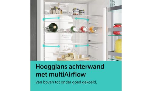 Als je koelkast niet gelijkmatig koelt, is al je producten vers houden een uitdaging. Dat is echter verleden tijd. De high-gloss achterwand met multiAirflow-technologie circuleert de lucht gelijkmatig voor een constante temperatuur op alle niveaus. Net aan de koelkast toegevoegde voedingswaren worden snel afgekoeld om de versheid optimaal te preserveren.