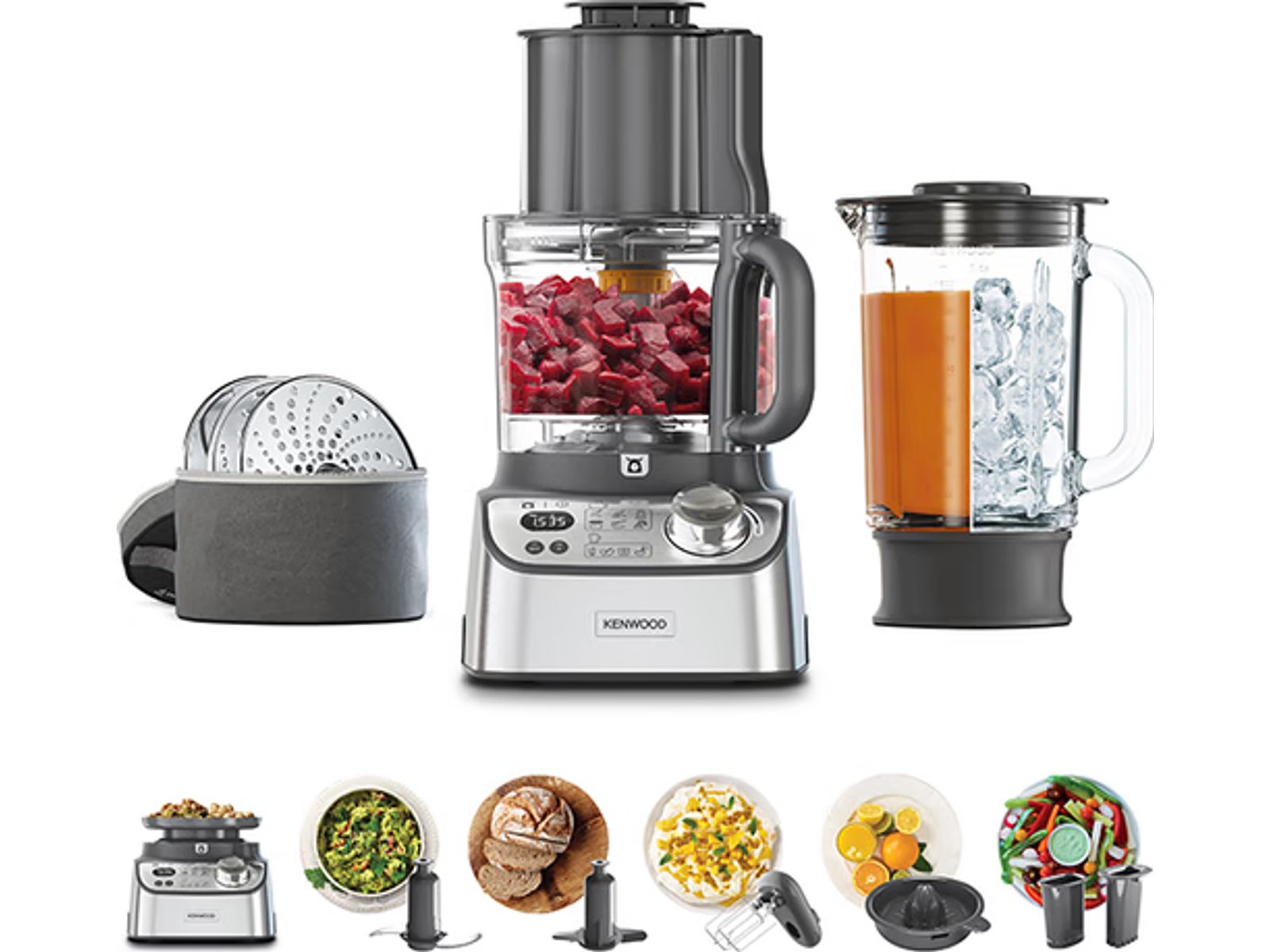 1000W, die cast metal base, 3L bowl with wide feed tube, 1,5L thermoresist glass blender, dough tool, dual metal wisk, citrus press, digital weighing and digital count up timer, dicer, ADJ SLICING DISC, reversible grating disc, extra fine grating disc, smartstore, Zilver