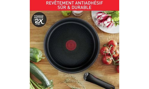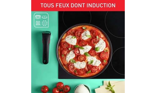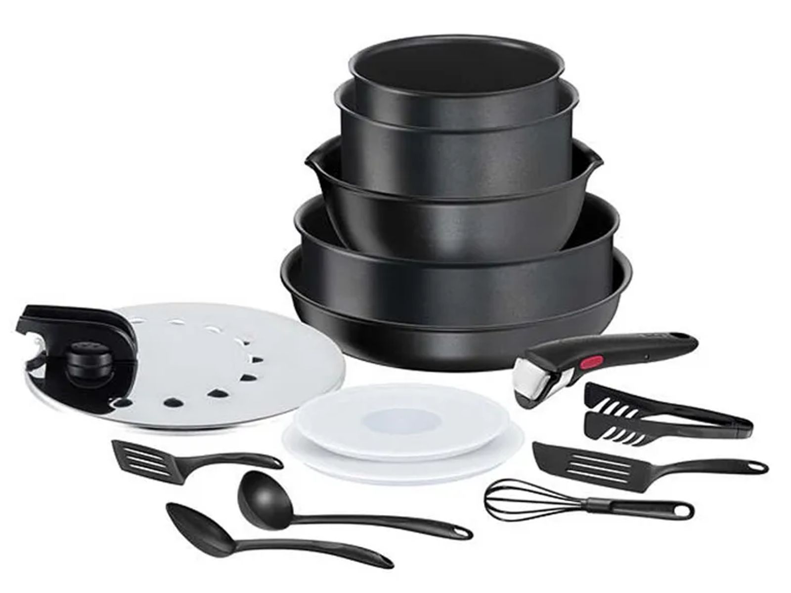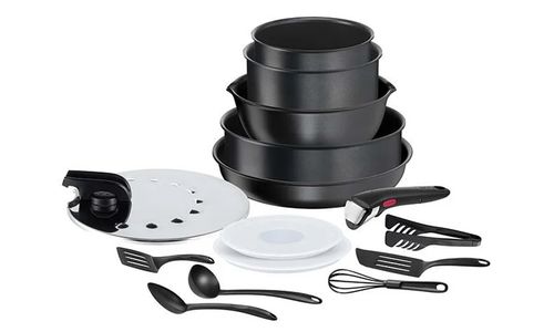15-delige set: Koekenpannen 22/26 cm + Schotelpannen 16/18 cm + Sauteuse 24 cm + Hermetische deksels 16/18 cm + Anti-spatdeksel 20-26 cm + 6 accessoires (lepel, garde, pollepel, tang, lange spatel, gehoekt) + 1 afneembare handgreep