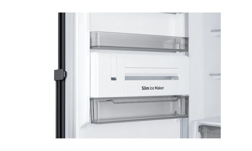 De compacte ijsdispenser neemt minder vriezerruimte in, omdat hij in de deur is geïntegreerd. Daardoor hou je kostbare extra opslagruimte over op de planken. Maar ijs zal zeker niet tekort hebben, want deze ijsdispenser kan nog steeds 5x de hoeveelheid opslaan die hij kan maken. En met één enkele beweging komen de ijsklontjes vrij.