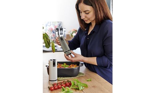 Het compacte ontwerp en de ribbels van de elektrische pepermolen Line beloven een optimale grip en dus een intuïtief gebruik in de keuken. Dankzij de eenvoudige, ingenieuze opening en het trechtervormige reservoir is vullen kinderspel. De nauwkeurige u’Select-regelaar is de kers op de taart. De afstellingsring in de voet van de molen heeft een maalgraad van 1 tot 6. Hij zorgt ervoor dat de peper altijd regelmatig is gemalen, welke grootte je ook verkiest. De elektrische Line-molen is nu al het perfecte geschenk, voor elke gelegenheid!