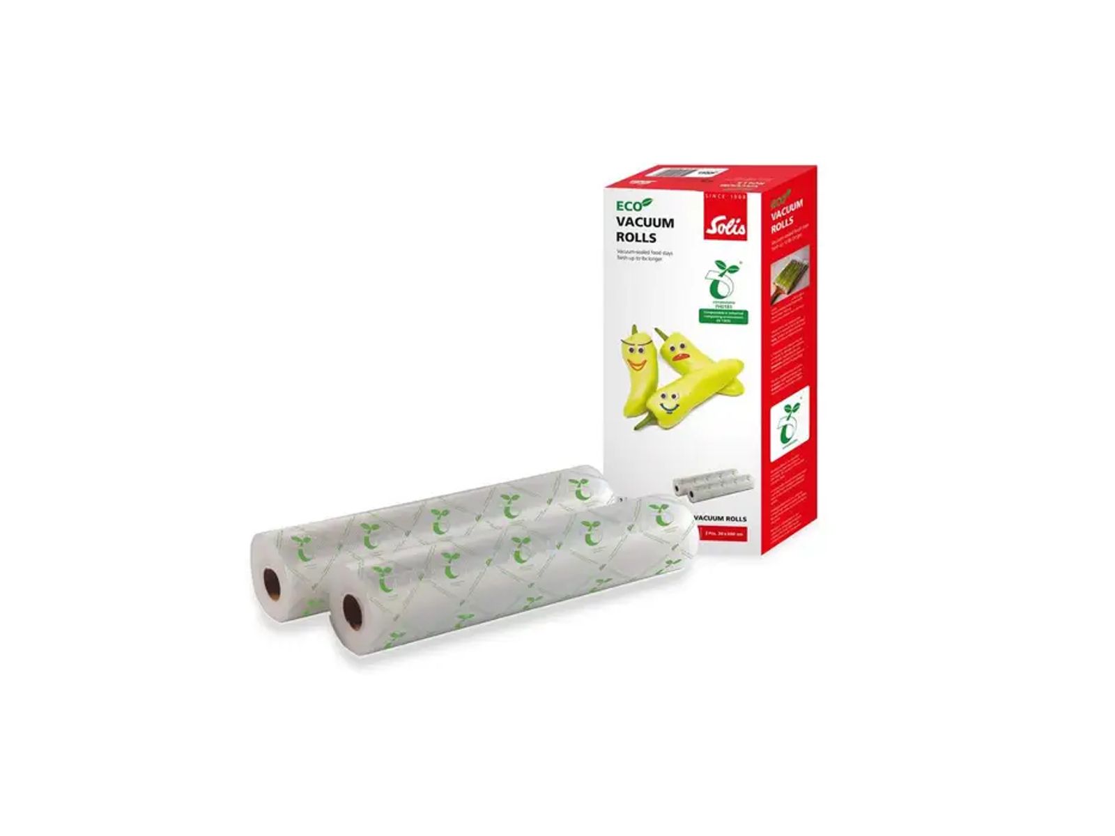 De ECO vacuümrollen zijn gemaakt van verschillende combinaties van biologisch afbreekbare grondstoffen zoals plantaardige cellulose. Ze zijn gemaakt van voedselveilig, BPA-vrij materiaal voor gegarandeerde veiligheid en kwaliteit; alleen echt met het Solis-logo op de folie.