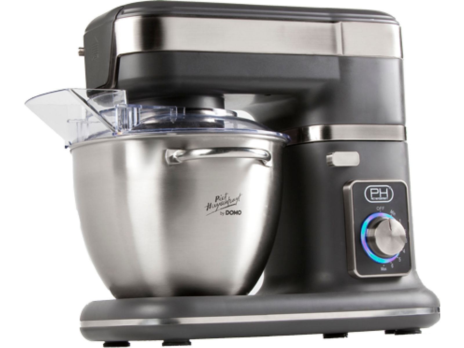De keukenrobot van DOMO heeft een krachtige motor van 1000 W. De kom uit geborsteld roestvrij staal heeft een inhoud van 4,5 liter en heeft een afneembaar, transparant antispatdeksel met vulopening. De snelheid kan je permanent en traploos instellen met de handige draaiknop met 8 standen. De planetaire werking van de keukenrobot zorgt voor een perfect mengresultaat. Het toestel wordt geleverd met klopper, deeghaak en roestvrijstalen ballongarde. Naast de versie in ‘Anthracite grey’ is de keukenrobot ook verkrijgbaar in andere kleuren.