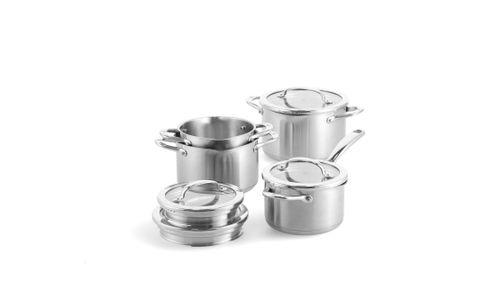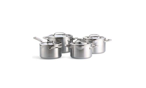 De pannenset bestaat uit vier kookpannen met diameters van 16 cm, 18 cm en 20 cm, en een steelpan van 16 cm