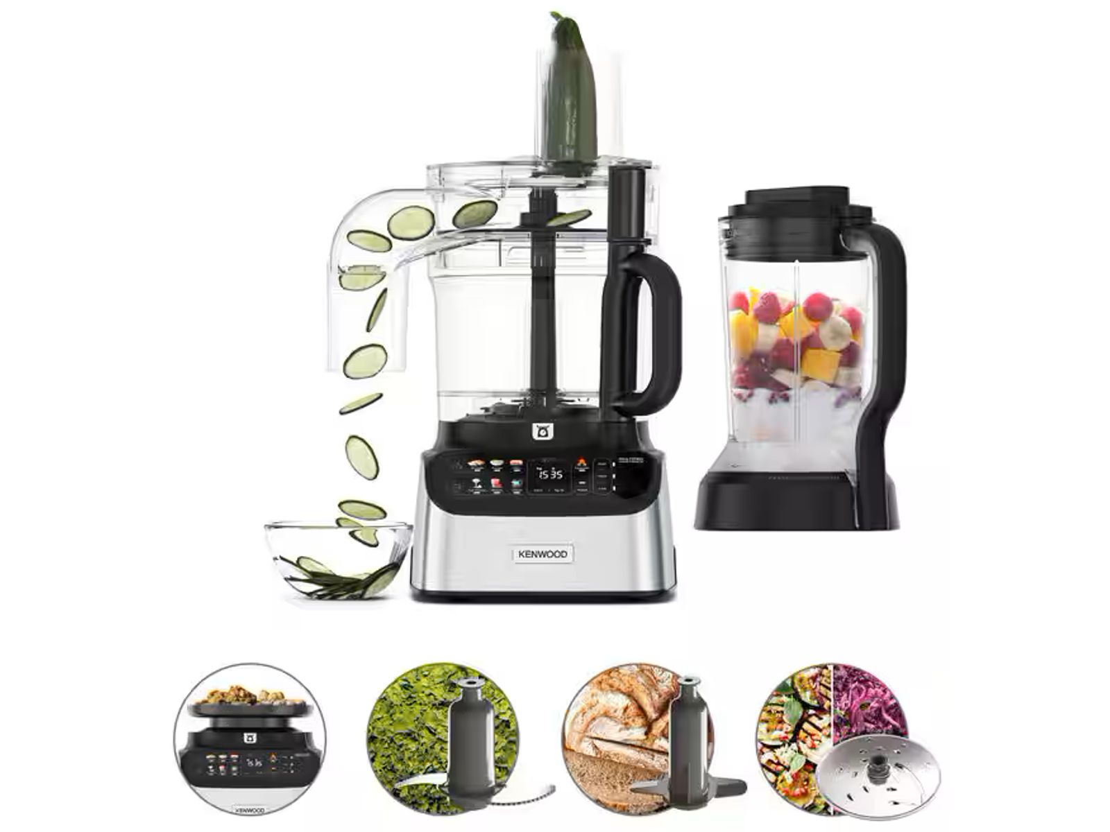 2-in-1-foodprocessor en blender. Inclusief automatische voorinstellingen, om ingrediënten met slechts één druk op de knop te bereiden, en een krachtige motor van 1000W. Met het originele alles-in-één-systeem van Kenwood kun je wegen, mengen, kneden, pureren, hakken, raspen, snijden, vermengen en zelfs ijs pletten.