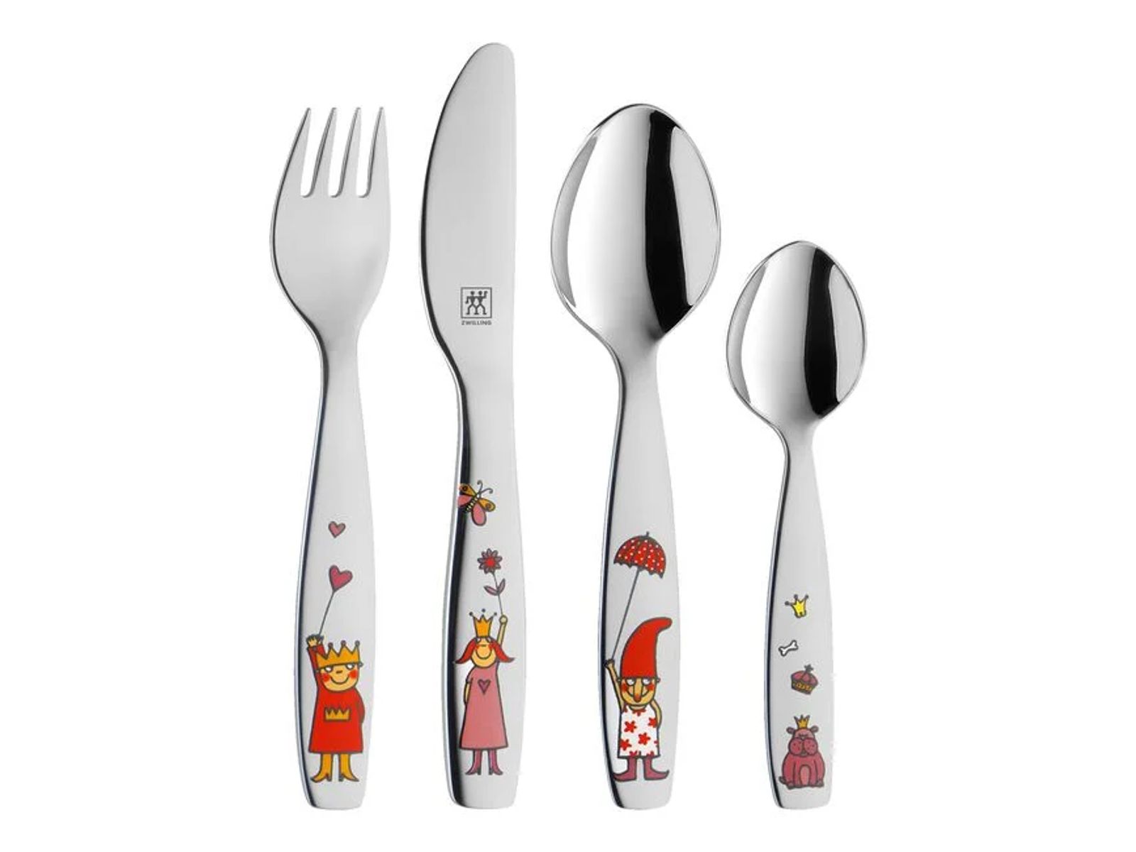 De vierdelige Princess Emilie kinderbestekset of ZWILLING is geschikt voor kinderen vanaf drie jaar. Het bestek past perfect in kleine kinderhandjes en helpt uw kinderen met mes en vork te leren eten. Deze kinderbestekset is vervaardigd uit roestvrij staal 18/10 en mag in de vaatwasmachine. Omdat het mes een botte, niet-gekartelde rand heeft, kan uw kind zijn/haar handen niet verwonden. Deze bestekset maakt eten leuk voor kinderen, stimuleert hun fantasie en motiveert hen om te eten. Aan de hand van de dierenprints vertelt elk item een verhaal.