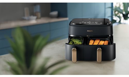 De Philips Airfryer uit de 3000-serie met twee manden zorgt ervoor dat twee gerechten tegelijk warm en klaar zijn. Geniet van lekker en gezond koken met een grote lade voor hoofdgerechten voor het hele gezin en een kleinere lade voor bijgerechten of eenpersoonsmaaltijden.