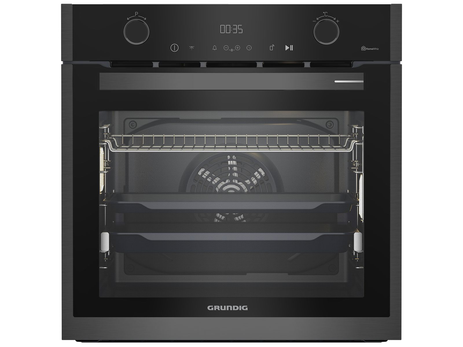 De Grundig Cool-Touch-Door met vierdubbele beglazing minimaliseert de hitte aan de buitenkant van de deur om brandwonden te voorkomen. Zelfs als de temperatuur in de oven 500°C bereikt, zal deze aan de buitenkant van de deur niet hoger worden dan 70°C. Als de warme lucht wordt geactiveerd met een ringverwarming, blijft de temperatuur aan de buitenkant onder de 40°C.