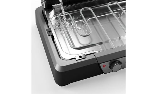 De Princess elektrische barbecue heeft een bak die je vult met water voordat je gaat grillen, waardoor weinig tot geen rook ontstaat. Het vet valt in het waterbad en koelen onmiddellijk af, zodat je geen ongezonde rook- of asdeeltjes op je eten krijgt. Het feit dat de elektrische barbecue minder rook genereert, maakt de barbecue perfect om te gebruiken tijdens bijvoorbeeld het kamperen.