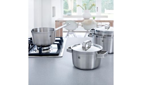 De BK Conical Profi pannenserie combineert design met gebruiksgemak. De hoogglans deksel en grepen vormen een stijlvol contrast met de geborstelde edelstalen body. Deze loopt conisch uit naar boven toe en wordt bekroond door een paar stevige grepen. De BK Conical Profi is voorzien van een sandwichbodem die zorgt voor een snelle opwarming en goede warmteverdeling door de hele pan. De BK Conical Profi is geschikt voor alle warmtebronnen, inclusief de oven.