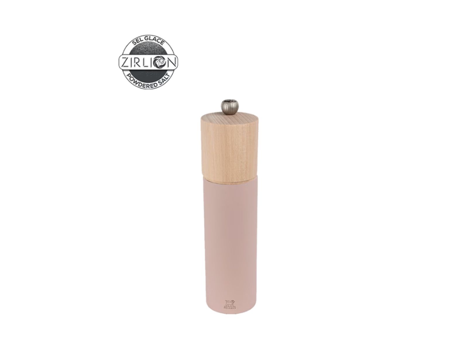 Deze zoutmolen, gemaakt in Frankrijk, valt op door zijn strakke uitstraling en eigentijdse charme. De matte en delicate roze tint die het lichaam van de molen bedekt, als een neutrale achtergrond, harmonieert met de kop van natuurlijk hout, die ook wordt beschermd door een matte vernis.