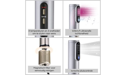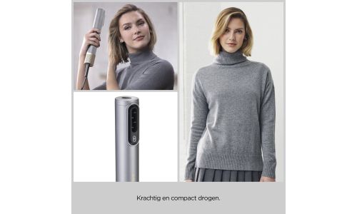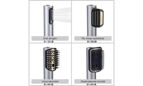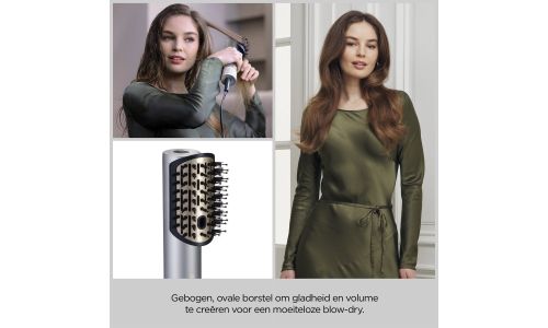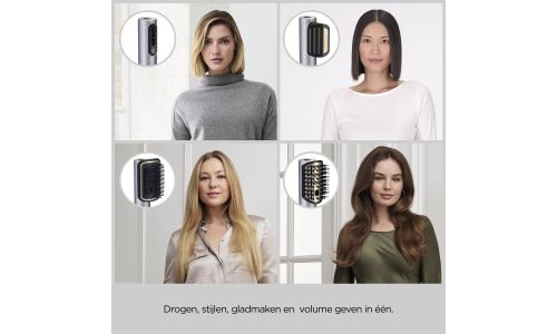 Nat en Droog volumiseren, gladstrijken en fly-aways verbergen, allemaal aangedreven door lucht. Snel en moeiteloos drogen, gladstrijken en stylen, alles in één, zonder schade door warmte.