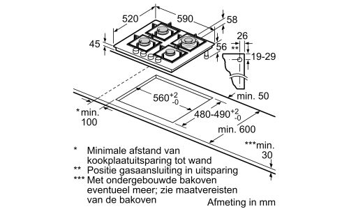++ Type kookplaat: Gas ++ Breedte: 59 cm ++ Aantal kookzones: 4 ++