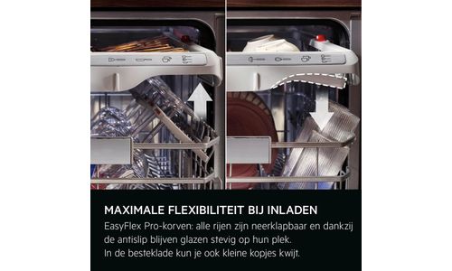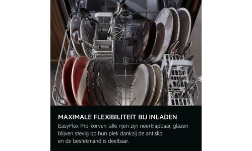 De EasyFlex Pro-korven glijden soepel en zijn volledig inklapbaar voor maximale flexibiliteit. Antislip rubberen houders en noppen houden glazen en wijnglazen stevig op hun plek en voorkomen botsingen. De besteklade biedt ruimte voor kloppers, soeplepels en kleine kopjes.