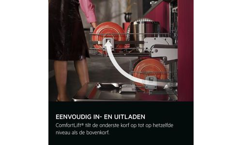 ComfortLift® brengt een volle korf tot 25 cm naar omhoog, zodat hij sneller en eenvoudiger kan worden in- en uitgeladen. Als de onderste korf eruit wordt getrokken, brengen speciaal ontworpen scharnieren deze korf naar hetzelfde niveau als de bovenste korf.