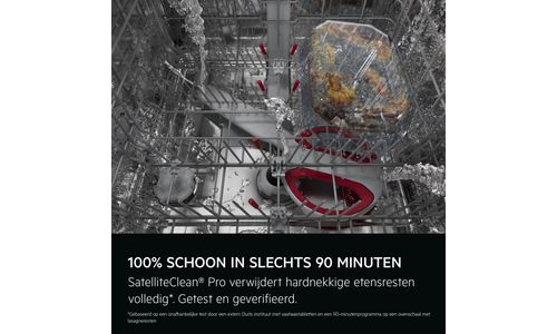 De dubbele roterende sproeiarm van SatelliteClean® Pro verspreidt water vanuit meerdere hoeken. Het resultaat: 100% verwijdering van hardnekkige resten in slechts 90 minuten, zonder extra waterverbruik.
