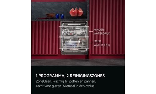 Activeer ZoneClean om de waterdruk in de sproeiarmen te verhogen voor het grondig reinigen van potten en pannen in het onderste rek, de druk in het bovenrek blijft laag voor delicate glazen. Twee zones, zonder extra water- of energieverbruik.