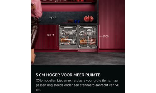 Reinig moeiteloos grote items zoals pizzaborden, hoge bierglazen of karaffen in onze XXL Max-modellen, zonder extra water of energie te gebruiken. Dankzij 5 cm extra binnenruimte en een lagere installatiehoogte past hij perfect onder een standaard aanrecht van 90 cm.