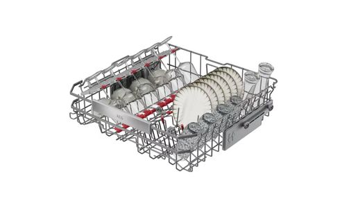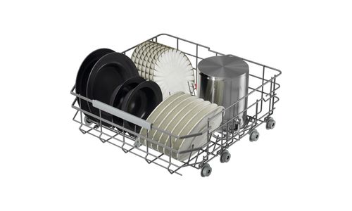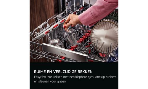 De vernieuwde EasyFlex Plus-korven glijden soepel en hebben drie opklapbare rijen voor moeilijk plaatsbare items. Rubberen houders en antislip-noppen houden glaswerk stevig op zijn plaats. De besteklade biedt zelfs ruimte voor een garde of een soeplepel.
