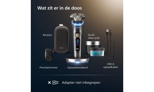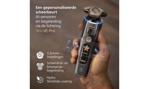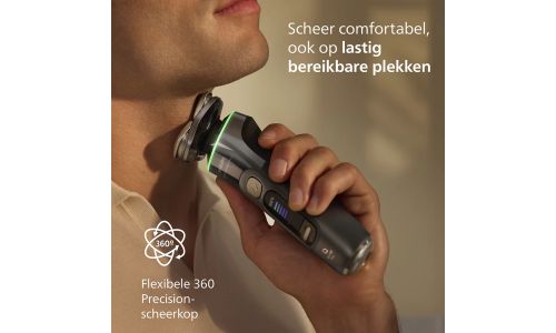 Langdurig glad, ongekend comfortabel met SkinIQ Pro-technologie Ervaar ons beste scheerapparaat voor een langdurig glad en ongekend comfortabel scheerresultaat, tot op -0,08 mm van de huid. Dankzij de compactere en flexibele scheerkop van de Philips i9000 Prestige Ultra scheer je ook glad op lastig bereikbare plekken zoals onder de neus en in de hals. Krijg realtime feedback via de lichtring, zodat je precies weet wanneer je te hard of te zacht drukt en of je de juiste scheerbewegingen maakt. Dit zorgt voor optimale scheerresultaten en minimaliseert huidirritatie. Personaliseer je scheerbeurt en jouw gewenste modus. Scheerresultaten Ons gladste scheerresultaat, tot op -0,08 mm van de huid Scheer ook glad op lastig bereikbare plekken Efficiënt bij elke beweging Comfort Altijd een schoon apparaat Trim je snor en bakkebaarden Scheer op jouw manier Open met één druk op de knop om eenvoudig te reinigen Handig op te laden Premium ervaring Een gepersonaliseerde scheerbeurt Ontworpen om lang mee te gaan: 7 jaar garantie****** Moeiteloos opladen met de LED-oplaadstandaard