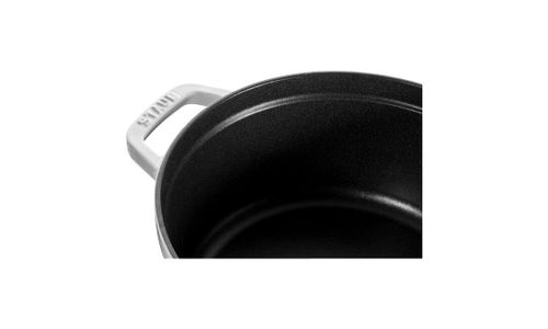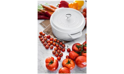 De Staub Cocotte is onovertroffen voor het langzaam garen van vlees en groenten tot ze perfect mals zijn en voor het sudderen van hartige soepen en stoofschotels. Gietijzer heeft uitzonderlijke warmtevasthoudende eigenschappen, waardoor het gelijkmatig wordt verwarmd. Het innovatieve deksel is aan de binnenkant voorzien van kleine puntjes die voortdurend gecondenseerd vocht terug op het voedsel laten druppelen, wat zorgt voor sappige, smaakvolle resultaten. De Cocotte is ook een geweldig serveerschaal, die rechtstreeks van het fornuis naar de tafel kan worden gebracht.