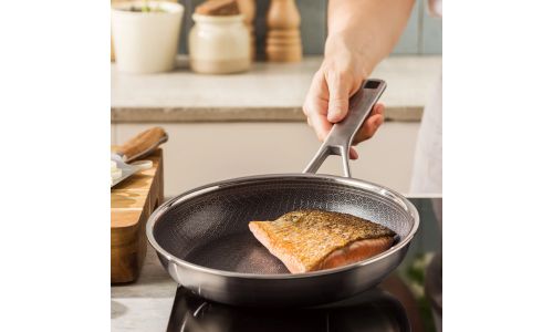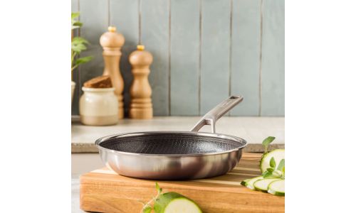 High-tech PFAS-VRIJE antiaanbaklaag met uniek roestvrijstalen patroon voor extreme krasbestendigheid en ultieme bakresultaten.