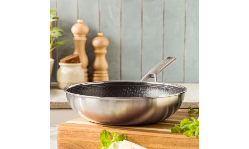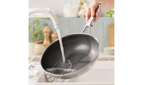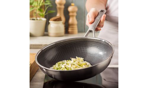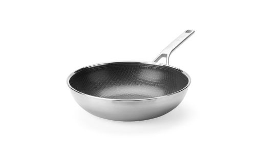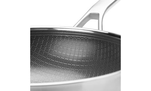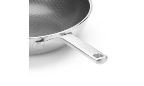 High-tech PFAS-VRIJE antiaanbaklaag met uniek roestvrijstalen patroon voor extreme krasbestendigheid en ultieme bakresultaten.