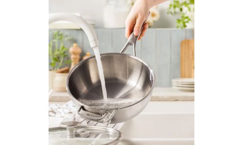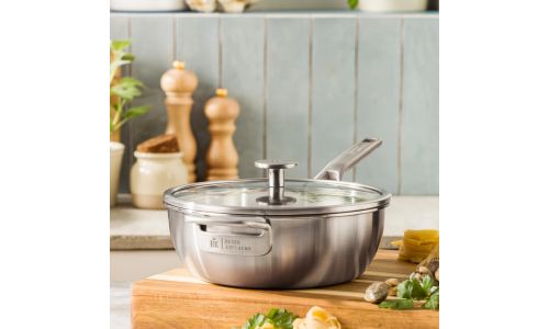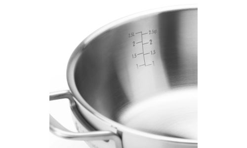 Ultrasterke constructie van twee lagen hoogwaardig roestvrij staal met een aluminium kern voor een gelijkmatige warmteverdeling en verfijnde kookprecisie.