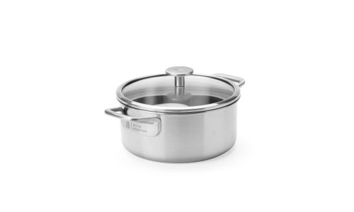 Ultrasterke constructie van twee lagen hoogwaardig roestvrij staal met een aluminium kern voor een gelijkmatige warmteverdeling en verfijnde kookprecisie.