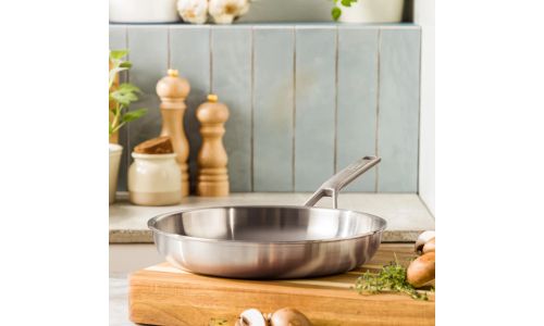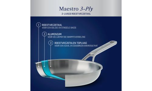 Maestro 3-Ply, ontwikkeld met driesterrenchef Peter Goossens, combineert kracht, finesse en vakmanschap. Het drielaagstaal (3-Ply) met aluminium kern en RVS buitenlagen zorgt voor perfecte warmteverdeling, maximale controle en behoud van smaken. Krasbestendig, duurzaam en geschikt voor intensief gebruik, met een elegant design. Ideaal voor wie elk gerecht naar een hoger niveau wil tillen.