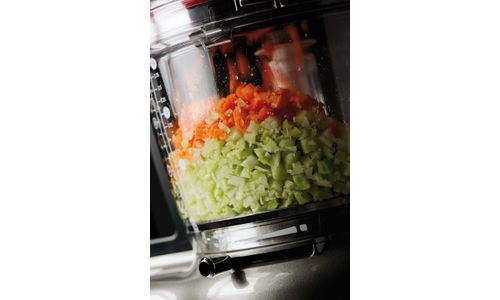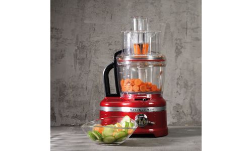 De Artisan 4 L foodprocessor is de alles-in-één foodprocessor die het voorbereiden van maaltijden makkelijk maakt en waarmee je zelfs complete maaltijden kunt bereiden. Het is een robuuste foodprocessor die gemaakt is van gegoten metaal om lang mee te gaan. Maal, hak, meng, pureer, kneed en klop ingrediënten. Er zijn 3 schijven om te raspen, te schaven of reepjes te snijden. Het ExactSlice systeem laat je de dikte van de plakjes bepalen met een unieke externe hendel. Doe het voedsel in de 3-in-1 vulopening, van flinke aardappels tot kleine worteltjes. Met de snijkit snij je fruit en groenten in blokjes. Wissel tussen de 3 BPA-vrije kommen van verschillende grootte, afhankelijk van wat je doet. Dit kan variëren van het hakken van een paar noten tot het raspen van Parmezaanse kaas, het maken van Franse frietjes of het kneden van brooddeeg. Gebruik de citruspers om eenvoudig vers citroen-, sinaasappel- en limoensap te maken. Of je nu kiest voor Keizerrood, Onyx zwart, Amandelwit of Appelrood, deze foodprocessor ziet er elegant en stijlvol uit. Met de opbergdoos hou je alle onderdelen netjes bij elkaar.