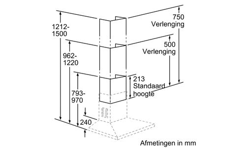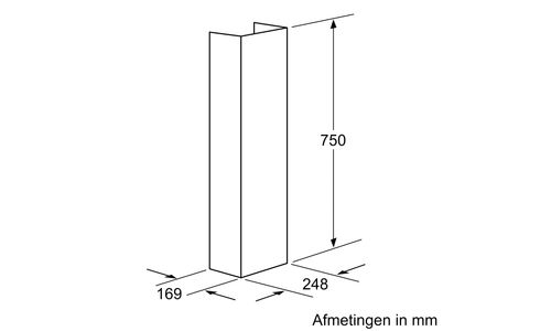 Verlengstuk ( 750 mm ) van het telescopisch gedeelte voor een wanddampkap. De totale hoogte van de dampkap kan van 280 mm tot 530 mm verlengd worden. Voor een totale hoogte van de dampkap van 1212 tot 1500 mm. Geschikt voor luchtafvoer of kringloopwerking.